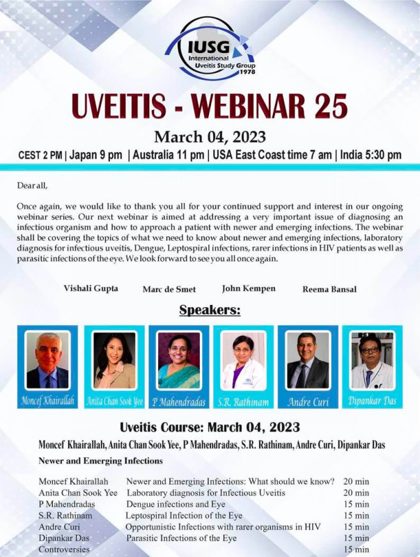 Datum: 04.03 2023Spletni seminar: Infekcijski uveitis, 4. marec 2023Povezava ZOOM: https://zoom.us/webinar/register/WN_tnKJPyt-RLmc4njajPTuyw